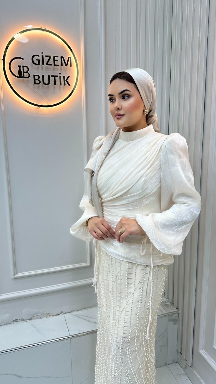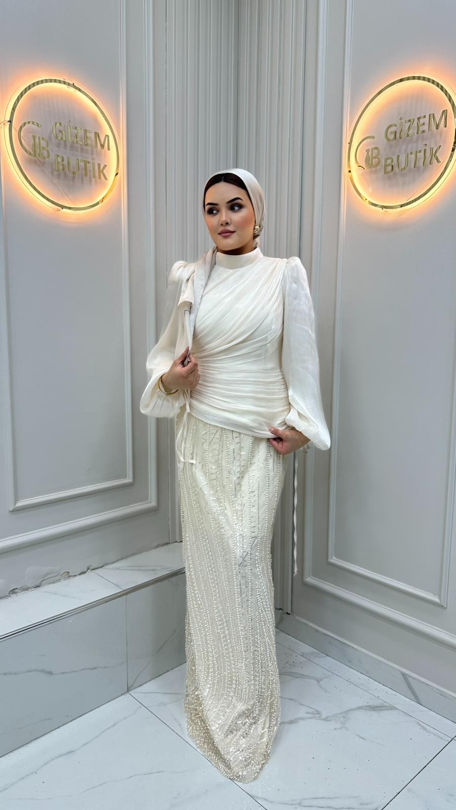 | Özellikler | Drapeli - Takım Görünümlü Birleşik Üstü Janjan Eteği Boncuk İşlemeli |