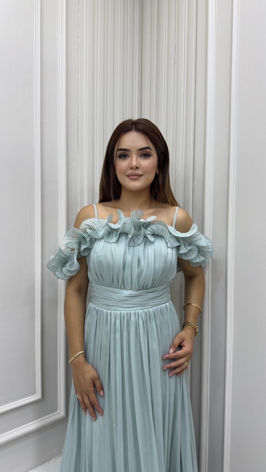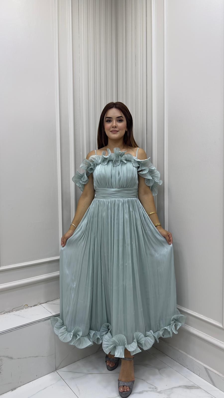 Özellikler | Askılı Önü Drapeli Etek ve Ömuza Kadar Fırfırlı |