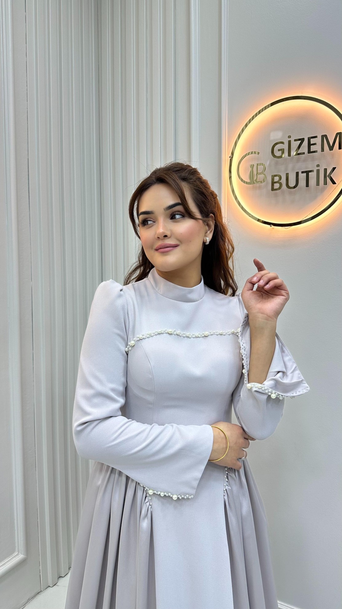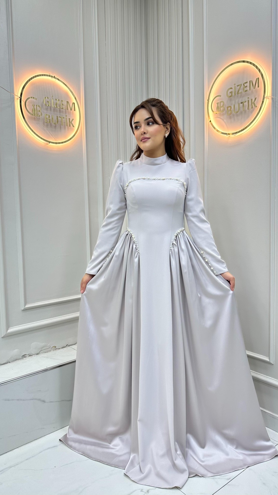 | Özellikler | Birleşik Saten Kumaş, Altı A Kesim, Üstü Dar Boncuk Detaylı |