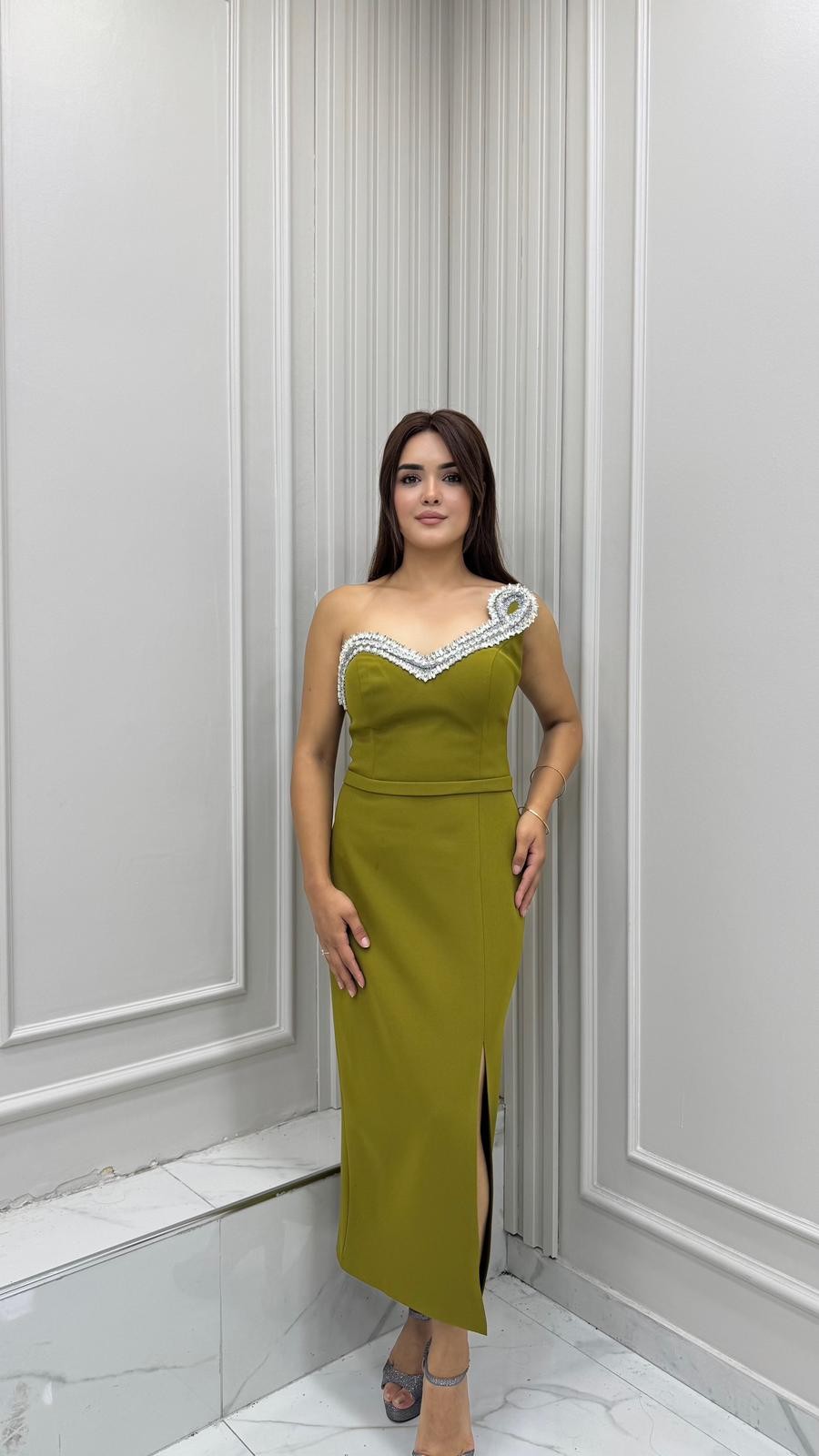 Özellikler | Gögüste Taş Detaylı Ömuza Kadar Tek Askı Önden Yırtmaç Modeli |