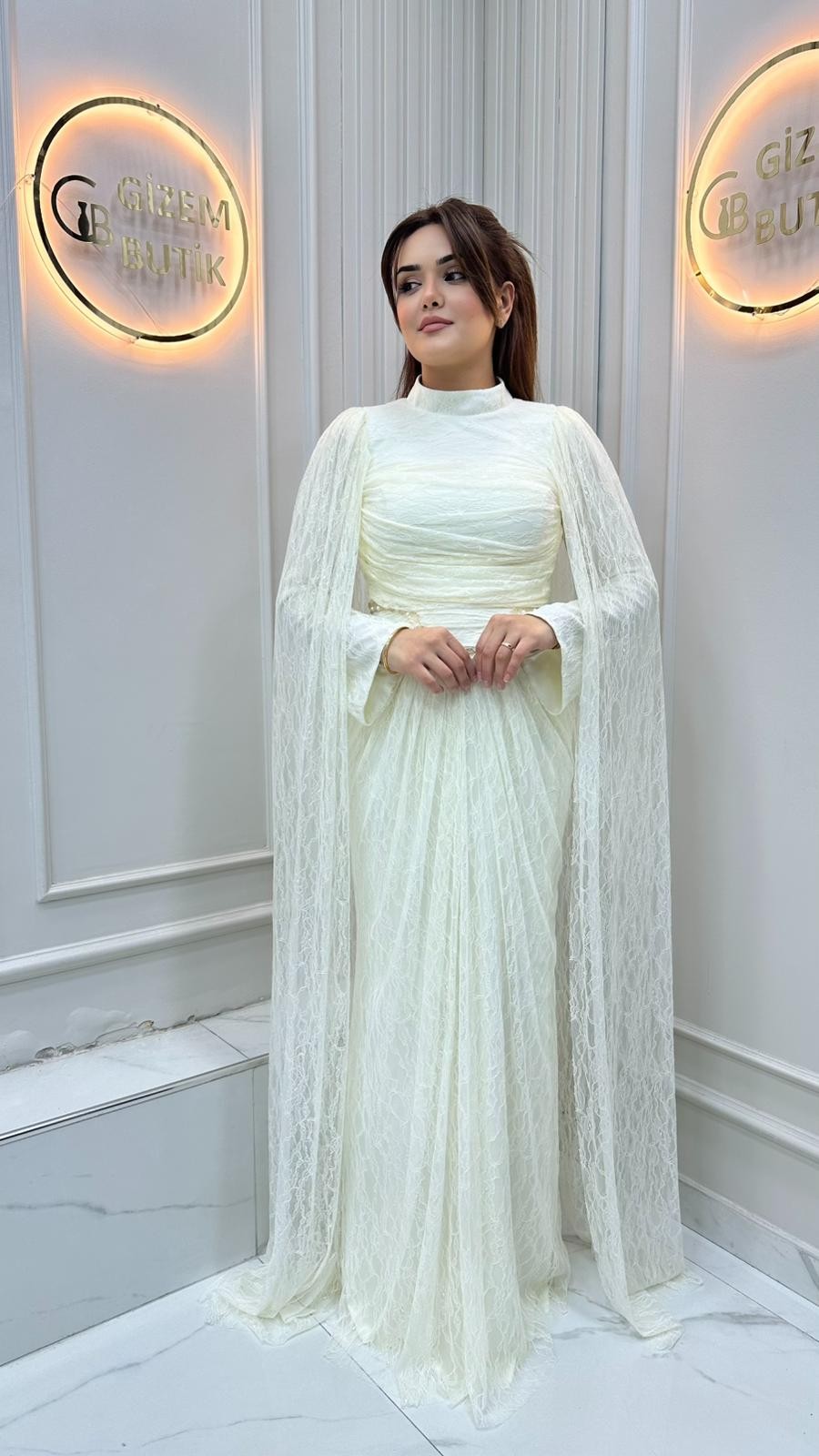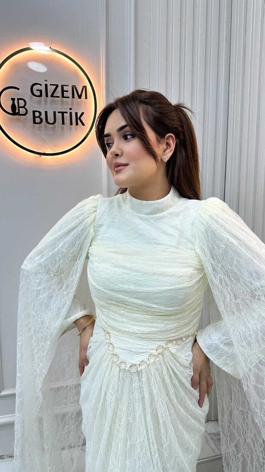 | Özellikler | Drapeli Bel Kısmı Taşlı - Kolları Birleşik Pelerin Detaylı |